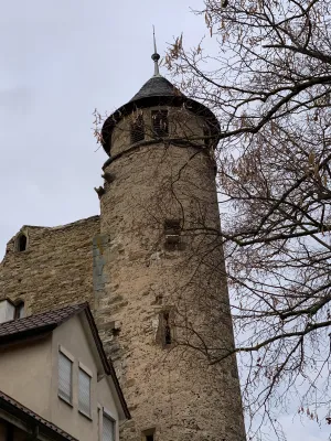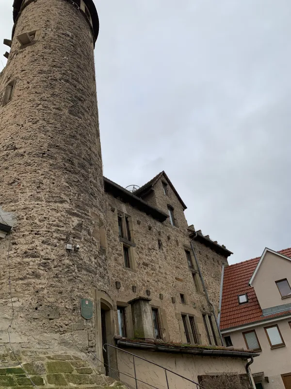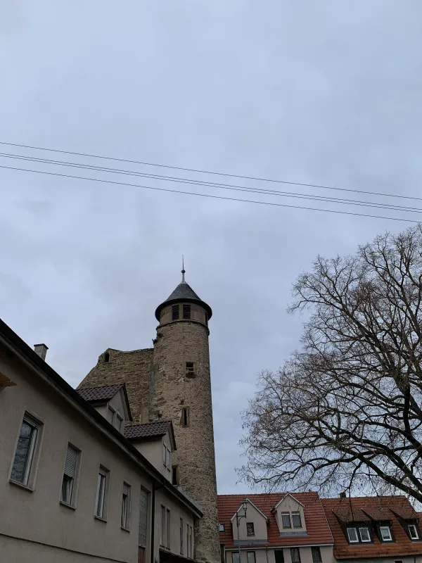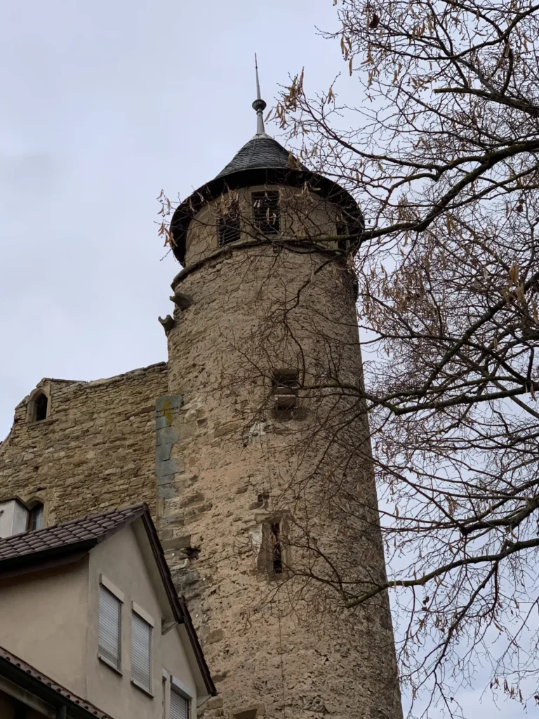 The town of Bönnigheim in the north of the Ludwigsburg district has an old town that is teeming with historic buildings. This is partly due to the fact that the town has had a long list of rulers. The Celts, Romans, Alemanni, Franks, and Habsburgs have all ruled here. After the town came into the possession of the Archbishopric of Mainz, it was purchased as a fief by Hirsau Abbey and sold to Bebenhausen Abbey in 1284. At this time, it was also granted town rights and construction of the town fortifications began. A mighty fortress with a 1,150-meter-long wall with a battlement around the city was erected, secured at each corner by a tower. In 1288, Rudolf of Habsburg bought the city, thus initiating the Ganerbiat. This meant that various knightly families shared their hereditary possessions. This Ganerbiat is still remembered today by the four most important Ganerben, the so-called co-heirs, whose names are immortalized in the four districts of Bönnigheim: the Sachsenheim district, the Neipperger district, the Gemminger district, and the Liebenstein district. For over 400 years, the town was ruled jointly by various noble lords, and it was not until 1750 that the Ganerbiat ended when Count Friedrich Stadion received Bönnigheim as a fief. The Ganerbenburg castle, which was built between 1250 and 1270 by the Lords of Magenheim as part of the northwestern town fortifications, also bears witness to the Ganerben period. Later, the castle became the property of the Ganerben. After the castle was destroyed in the Peasants’ War in 1525, it was rebuilt in 1546. The Liebenstein part was demolished in 1679 and a wine cellar was built in its place. In 1898, the bell from the Cyriakus Church, dating from 1359, was installed in the tower, which was then given a roof. The castle was renovated in 1979. The rectangular castle complex once had a wall and a moat facing the town. Today, the remains of the old Ganerbenburg castle and the stair tower with a conical roof leading to the former courtyard are still preserved on the castle square. The Ganerbenburg castle not only still dominates the medieval skyline of Bönnigheim, but is also an important cultural asset that provides interesting insights into the history of the town. This stone witness to history, only partially preserved today, gave me a fascinating insight into medieval life in the town.
