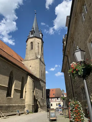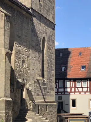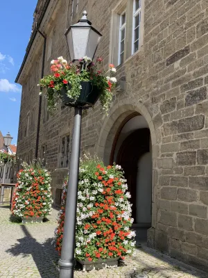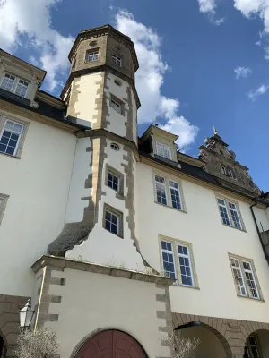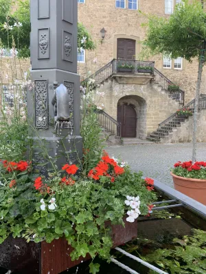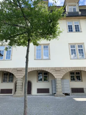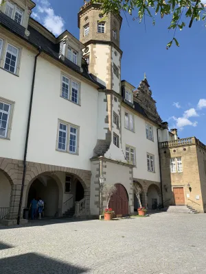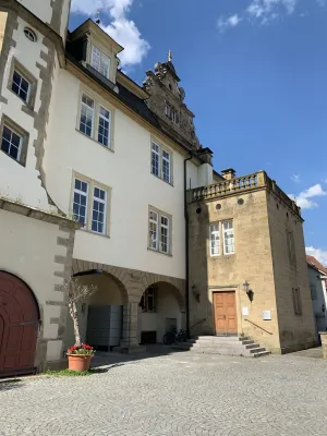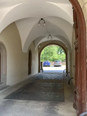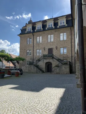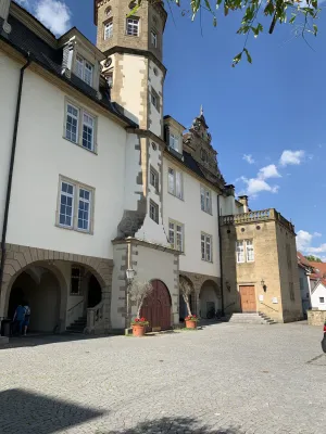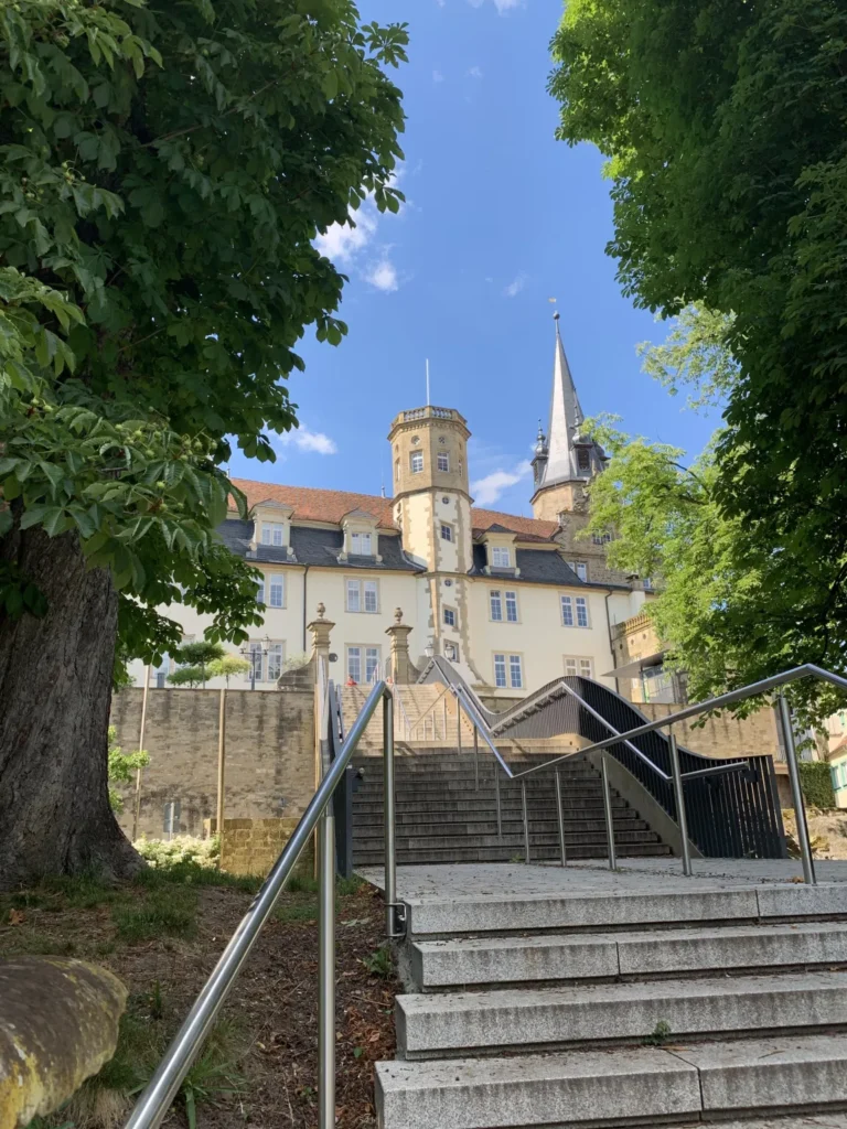 One of the sights and landmarks of the former royal seat of Öhringen, whose roots date back to Roman times, is the castle. It was built in 1611 in Renaissance style according to the plans of Georg Kern, master builder to the Counts of Hohenlohe. Originally, Öhringen Castle served as the widow’s residence of Countess Magdalena von Hohenlohe. In the course of history, it became the princely seat and residence of the House of Hohenlohe. The oldest part of the castle, the Lange Bau, was built between 1611 and 1616. After suffering damage during the Thirty Years’ War, the castle was repaired. Between 1681 and 1683, the stables were added. Stables for 30 horses were built on the ground floor. Between 1714 and 1715, the arcades on the courtyard side, the corridors built above them, and a mansard roof were added. This was followed by the construction of the coach house with a Rococo library and open staircase in the castle courtyard between 1770 and 1775. Between 1813 and 1814, a classicist building for the crown prince was added and the open staircase to the courtyard garden was redesigned. A fundamental renovation of the state rooms of the Blue Hall, the dining room, and the White Hall was carried out in 1847. A year later, in 1848, the princely family moved their residence to Slawentzitz in Upper Silesia. It was not until 1945, after losing his possessions there, that August zu Hohenlohe-Öhringen returned with his family to the south wing of Öhringen Castle. He lived there until his death in 1962. In 1961, the town of Öhringen acquired the castle and the courtyard garden and renovated it extensively between 1976 and 1987. Today, the castle is home to the town administration. The historic rooms, such as the Blue and White Halls, the Landscape Room designed by the court painter Schillinger, and the huge vaulted cellar, serve as event locations. Öhringen Castle, located in the historic town center, with its huge guild tree in front of the castle facade, is really worth seeing. I reached the picturesque castle courtyard with its magnificent fountain through an archway. The courtyard side revealed the octagonal spiral staircase tower with a cellar neck leading to the 120-meter-long castle cellar. Until 2009, this was used by the castle winery of the Prince of Hohenlohe-Öhringen for wine production. From the magnificent castle courtyard, an open staircase leads to the baroque courtyard garden, a green oasis in the middle of the city, which together with the castle forms a wonderful ensemble of local recreation and excursion destination.