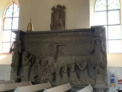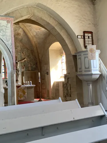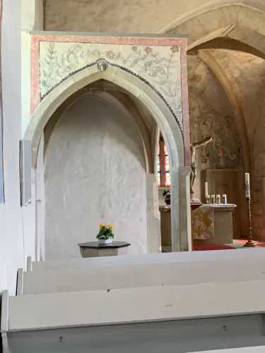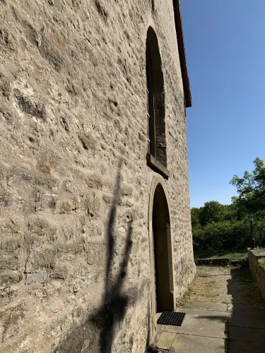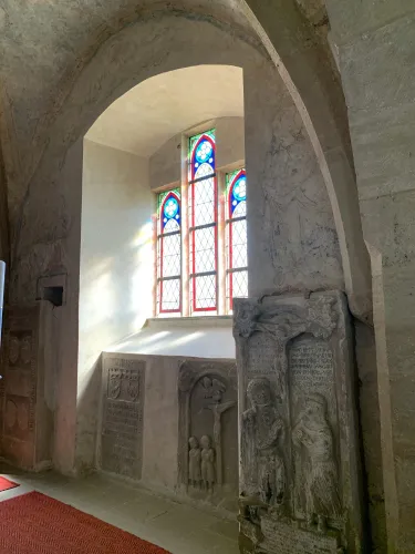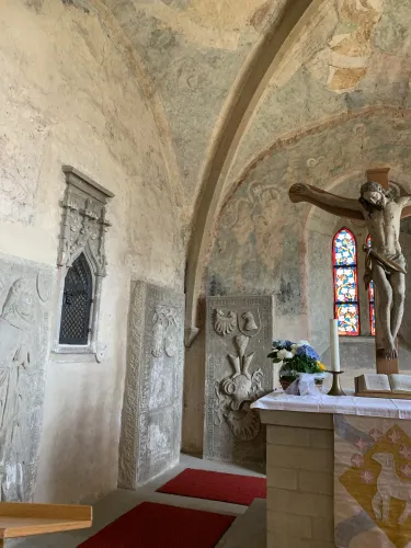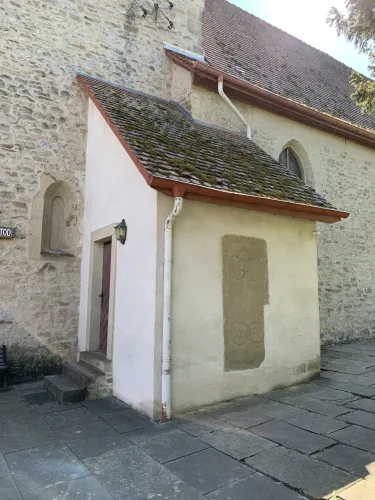 Above a small village called Heinsheim, a district of the Baden-Württemberg town of Bad Rappenau, a mountain church from the 9th century sits enthroned on a ridge. This mountain church is one of the oldest rural churches in southwestern Germany and was built on a druid site. Druid sites look back on a tradition that goes back thousands of years. Special mountains or springs were used as places of worship, from which a magical energy emanated that had a beneficial effect on the body, mind, and soul. One such place was the ridge above Heinsheim. A wooden baptistery was once built here at a spring that still flows today, and was later replaced by a single-nave stone building with a flat ceiling and an imposing tower in the Romanesque style. The mountain church, which rises 110 steps above the village of Heinsheim, was first mentioned in writing in 965 in the Cartularium Wormatiense. However, archaeological finds testify to its use as early as Roman times and from the 7th/8th century onwards. The mountain church is dedicated to St. Hilarius and was the main church and burial place of the Lords of Ehrenberg from the High Middle Ages until the extinction of the family in 1674. The church was renovated several times in the 18th and 19th centuries. I could see the square tower of the church from afar and entered through a simple wooden portal. My first glance fell on the wall and ceiling frescoes in the choir room, which were uncovered in 1957. I was particularly impressed by the wall fresco of St. Christopher, which dates from 1280 and was discovered by chance during an interior renovation in 1963. The oldest frescoes in the church, the four symbols of the evangelists, dating from around 1250, are located in the cross vault of the tower above the altar. I marvelled at the frescoes on the side walls of the choir, which show Christ on the throne of judgement and on the throne of mercy. On the eastern rear wall of the choir are late Gothic frescoes from 1500 depicting the two saints St. Hilarius and St. Maximinus in medieval bishop’s robes with knights of Ehrenberg kneeling on their coats of arms. I was also able to admire the tomb slabs of the Ehrenberg knightly family on the walls of the choir room. In 1959, the current simple stone altar was erected and six old knight’s tombs were found at a depth of 1 meter. The tomb slabs date from around 1400 to 1700. The nave contains the largest tomb monument for the knight Johann Heinrich von Ehrenberg and his wife Margaretha with their eight children. I was also impressed by the Gothic baptistery with its hand-carved basalt head of Christ and beautiful ornaments on the outside, as well as stars and flames on the interior ceiling with the head of John the Baptist. The organ loft is located on the west side of the nave opposite the stone altar. The colorful mosaic windows are also well worth seeing and create a wonderful play of light inside the church. Even the exterior of the church is a real eye-catcher with its massive defensive walls and the adjacent cemetery with its large gravestones, which, however, has not been used since 1777. I also discovered the spring, which was a place of mission and baptism in Franconian times. The idyllic location of the mountain church with its spring, massive stone building, and cemetery had something mystical about it and held a special appeal for me. I had never seen such an old sacred building that radiated such incredible energy. The Heinsheim mountain church is a special church that is still used for services by the Protestant parish, alternating with the castle chapel in Heinsheim. I found peace in this place and was able to recharge my batteries and find positive thoughts. Because, as Buddha said: “What you think, you are. What you are, you radiate. What you radiate, you attract.”