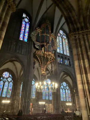 Strasbourg Cathedral is an undeniable masterpiece of Gothic architecture and a landmark of historical and artistic significance. A monument built on layers of history. Construction of the original Romanesque cathedral began in 1015, but today only the crypt and the floor plan remain. The iconic Gothic tower of today’s cathedral was completed in 1439. Victor Hugo once described it as “a marvel of colossality and delicacy,” an impression reinforced by the elaborate and ornate details of the façade. With its 142-meter-high tower, the cathedral was the tallest building in Christendom until the 19th century. Notre-Dame de Strasbourg Cathedral (French: Cathédrale Notre-Dame de Strasbourg), commonly known as Strasbourg Cathedral, is a Roman Catholic building in Strasbourg, Alsace. It is one of the most important church buildings in European architectural history and is one of the largest sandstone buildings in the world. This Romanesque-Gothic basilica is an example of a harmonious fusion of German and French cultural influences. The cathedral was built between 1176 and 1439 from pink sandstone from the Vosges mountains, replacing earlier buildings that had been destroyed by fire in 1007 and 1015. Construction progressed from northeast to southwest, initially in the Romanesque style before transitioning to the Gothic style. The cathedral’s 142-meter-high north tower was the tallest building in the world from 1647 to 1874. Renowned architects such as Erwin von Steinbach and Ulrich Ensinger were involved in its design. Despite war damage in 1870 and 1944 and the iconoclastic unrest of the Reformation, the interior and decorations of the cathedral have been preserved. The maintenance of the cathedral has been managed since at least 1281 by the Œuvre Notre-Dame, which also runs the Maison de l’Œuvre museum. A lasting symbol of Alsace. The cathedral’s striking asymmetrical shape—its south tower was never completed—remains a landmark of Alsace. Visible from the German banks of the Rhine, as well as from the Vosges and Black Forest mountains, its presence is unmistakable. On clear days, the cathedral’s tower can even be seen from the Turmberg in Karlsruhe and the Trifelsblick hut near Gleisweiler, which are about 50 and 55 miles away, respectively. Among the most famous sights inside the cathedral are the astronomical clock and the “Pillar of Angels.” Other notable features include the pulpit, the baptismal font, the swallow’s nest organ, the stained glass windows, and the tapestries depicting the life of the Virgin Mary – each of which is a testament to Western art. Both Catholic and various Reformation preachers have served in the cathedral, which remains the seat of the Archdiocese of Strasbourg. Origins: From pagan temple to early Christian church. The hill on which the cathedral stands was once the site of a Roman temple dedicated to Hercules and Mars, and possibly even an older Druidic sanctuary. In the 4th century, a Christian wooden shrine stood on this site. In 510, King Clovis I commissioned the construction of a stone church, which was later enlarged under Bishop Arbogast and Dagobert in 675 and rebuilt in the Carolingian style around 775, before being destroyed by fire in 873. These early buildings have largely been lost, and their exact location is unknown. Romanesque and early Gothic phase. In 1007, the rebuilt church was struck by lightning, prompting Bishop Werner to commission the construction of a large three-nave basilica in 1015, which was repeatedly damaged by fires until 1176. Archaeological finds from 2012, including a massive lime kiln probably used for the construction, provide insights into its past. In 1190, a new phase of construction began in the late Romanesque style. The crypt was extended to the west, and the apses, choir, and transept were built on the foundations of the previous building, which led to certain irregularities, such as the pillars in the middle of the transept, which were necessary for the vaults. High Gothic splendor. Around 1245, work began on the nave in the High Gothic style, which is characterized by elaborate triforia. By 1275, the new nave was completed, and in 1277, under the direction of Erwin von Steinbach, the foundation stone for the west facade of the cathedral was laid, which was continued by Erwin’s son Johannes after Erwin’s death in 1318. The west facade, which was originally planned with two towers, underwent changes in design and execution over time. By 1383, Michael von Freiburg had connected the towers with a bell tower, creating a uniform facade block reminiscent of the vertical structure of Notre-Dame de Paris. From 1399, under the direction of Ulrich Ensinger and later Johannes Hültz, the octagonal upper floors of the north tower were added, which were crowned with an openwork spire in 1439 and reached a height of 142 meters. Although plans existed to complete the south tower, these were never implemented. Later developments and restoration. Between 1495 and 1505, the richly decorated Laurentius portal on the northern transept was built by Jakob von Landshut. In 1835, a lightning rod was installed, disturbing the tomb of Erwin von Steinbach. Gustave Klotz led the restoration after the artillery damage of the Franco-Prussian War in 1870, replacing the central tower with a larger one by 1875 and decorating the choir with neo-Byzantine frescoes by Eduard von Steinle. Despite heavy bombing during World War II, the stained glass windows, which had been safely stored elsewhere, and the richly decorated west facade remained intact, preserving the cathedral’s splendor. Strasbourg Cathedral is not only an outstanding example of Gothic architecture, but also a living chronicle of cultural and historical change, from Roman times to medieval innovations to modern restoration work. Its elegance, historical significance, and artistic splendor continue to fascinate visitors from all over the world.