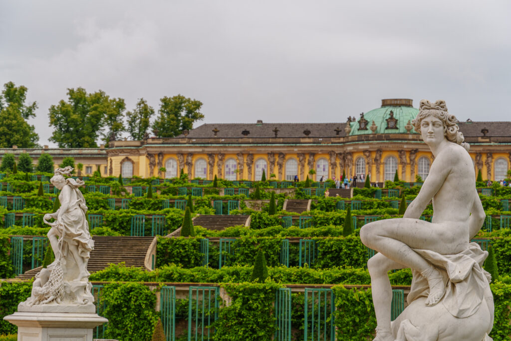 The creation of splendor. The origins of Sanssouci date back to the mid-18th century, when Frederick the Great, King of Prussia, envisioned a retreat from formal court life. Sanssouci was primarily conceived as a summer palace and was intended to be a place where the king could indulge his love of art and philosophy far from the pressures of government. The creation of this idyllic retreat began in 1745 under the careful supervision of Georg Wenzeslaus von Knobelsdorff, the chief architect tasked with realizing Frederick’s vision. The construction of Sanssouci was a labor of love and precision, resulting in a Rococo masterpiece that perfectly reflected the king’s personality and aspirations. The location was carefully chosen on a terraced vineyard to ensure that the view from the palace was as captivating as the building itself. Every aspect of Sanssouci exudes elegance, from the elaborate stucco work and sumptuous interiors to the extensive gardens designed by Peter Joseph Lenné.