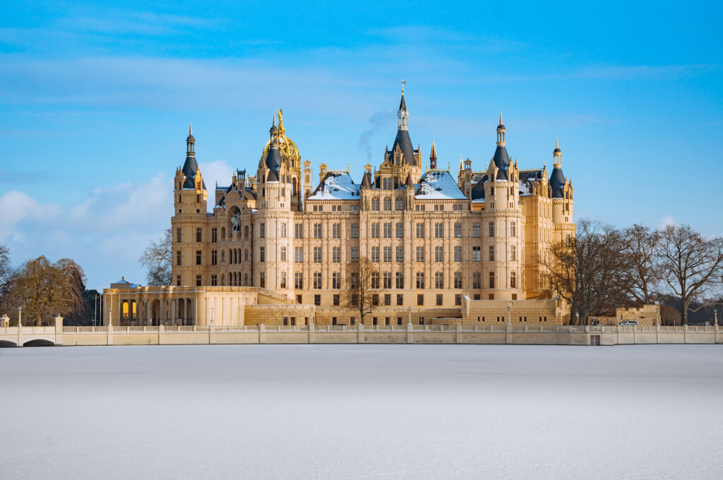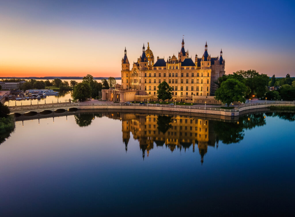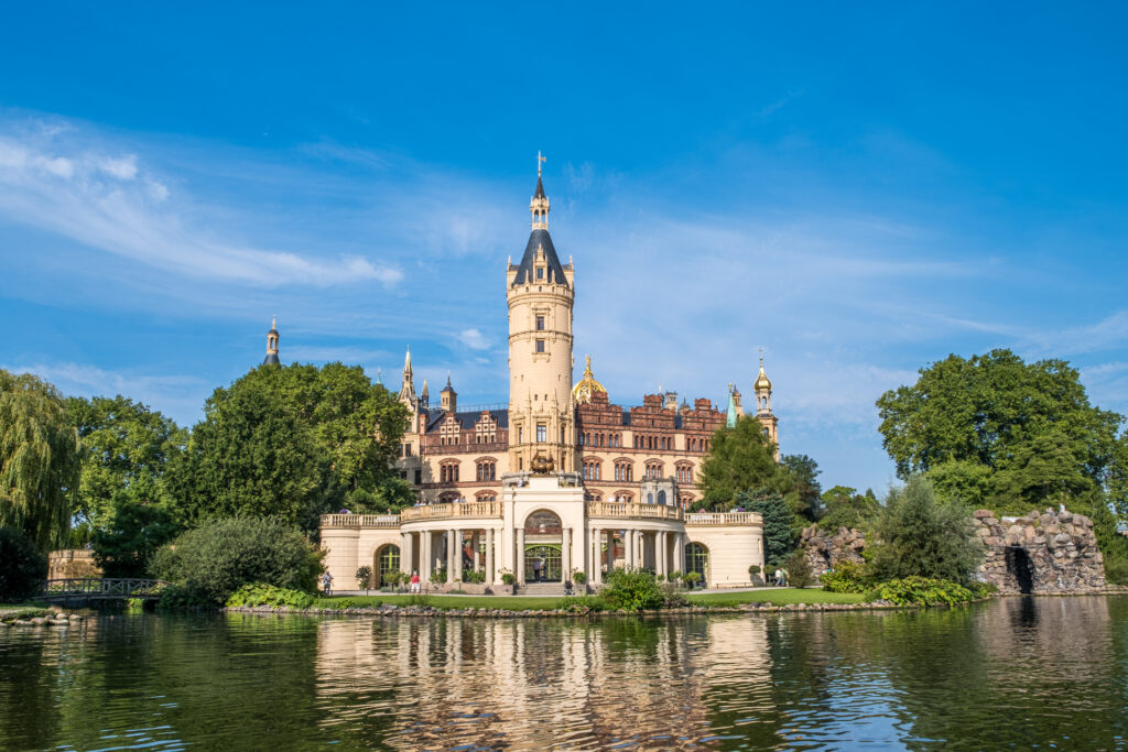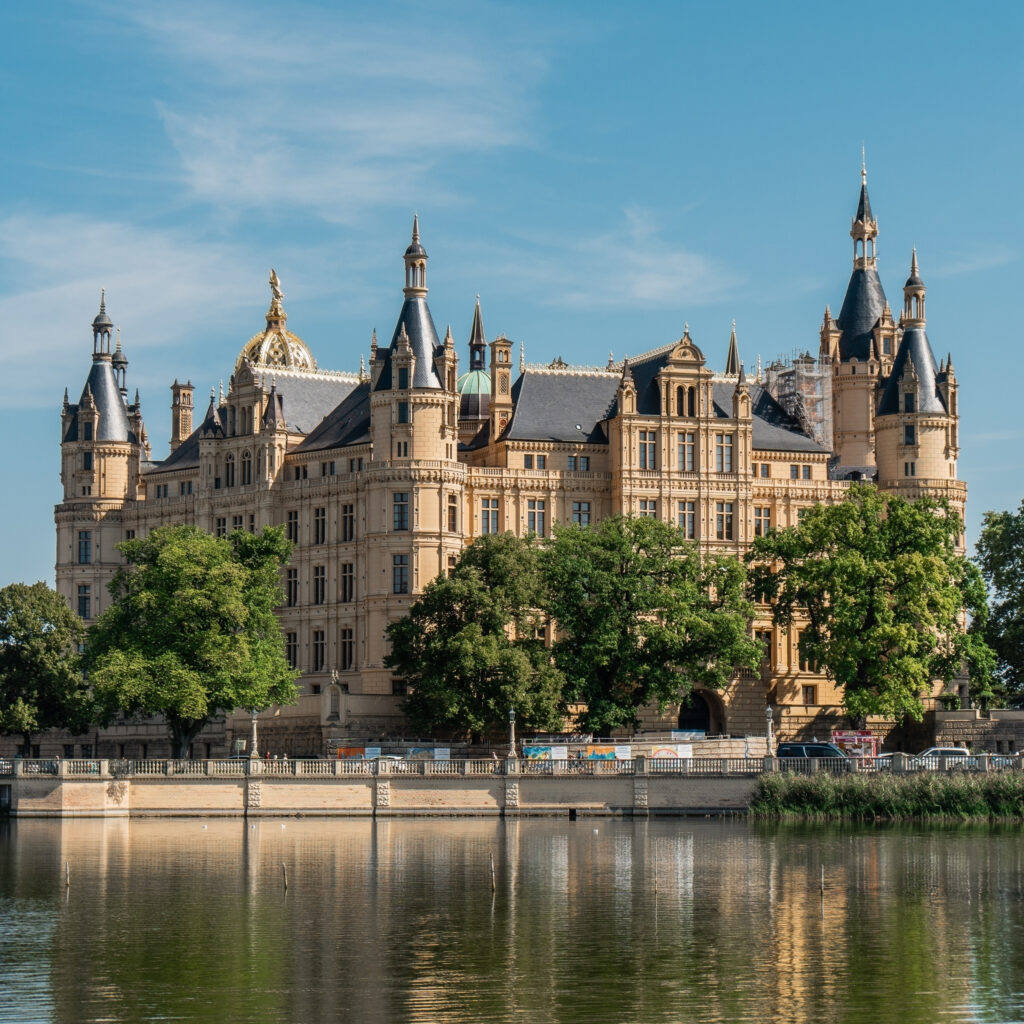 Origins in Obotrite foundations. The illustrious history of Schwerin Castle began on a much more modest scale than its current splendor would suggest. Its roots date back to the 10th century, to the Slavic Middle Ages, when the ruling Obotrites, ancestors of the Mecklenburg princes, built a fortified castle on an island in Lake Schwerin. Archaeological excavations have uncovered remains of this early fortification, including a Slavic rampart that formed the core of today’s castle. This original structure served the Obotrites both as a defensive bulwark and as a symbol of their power. In the late 14th century, the Obotrites, who had since been Christianized and were integrated into the German Empire as Dukes of Mecklenburg, began to transform the earthen ramparts into an increasingly permanent stone residence.