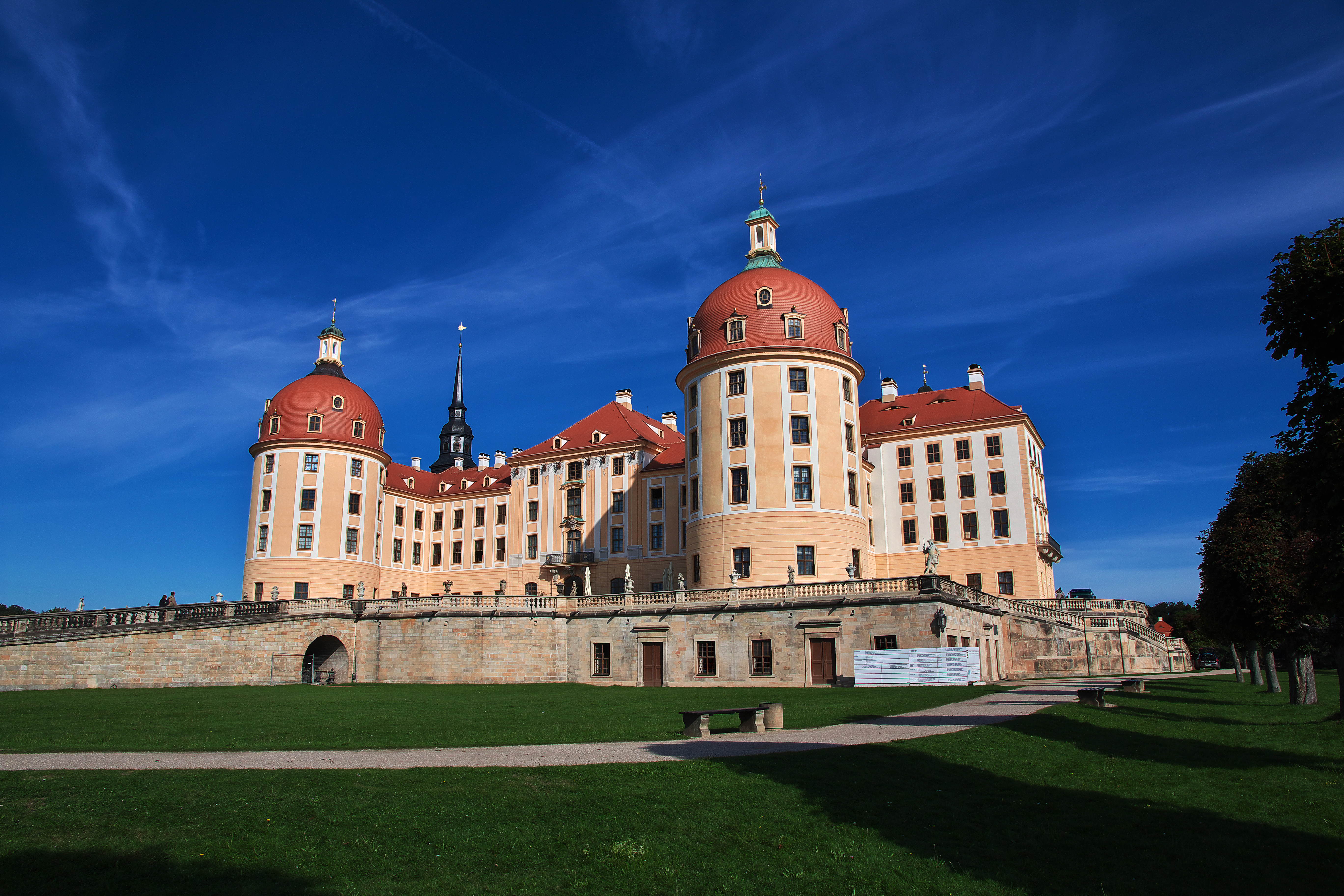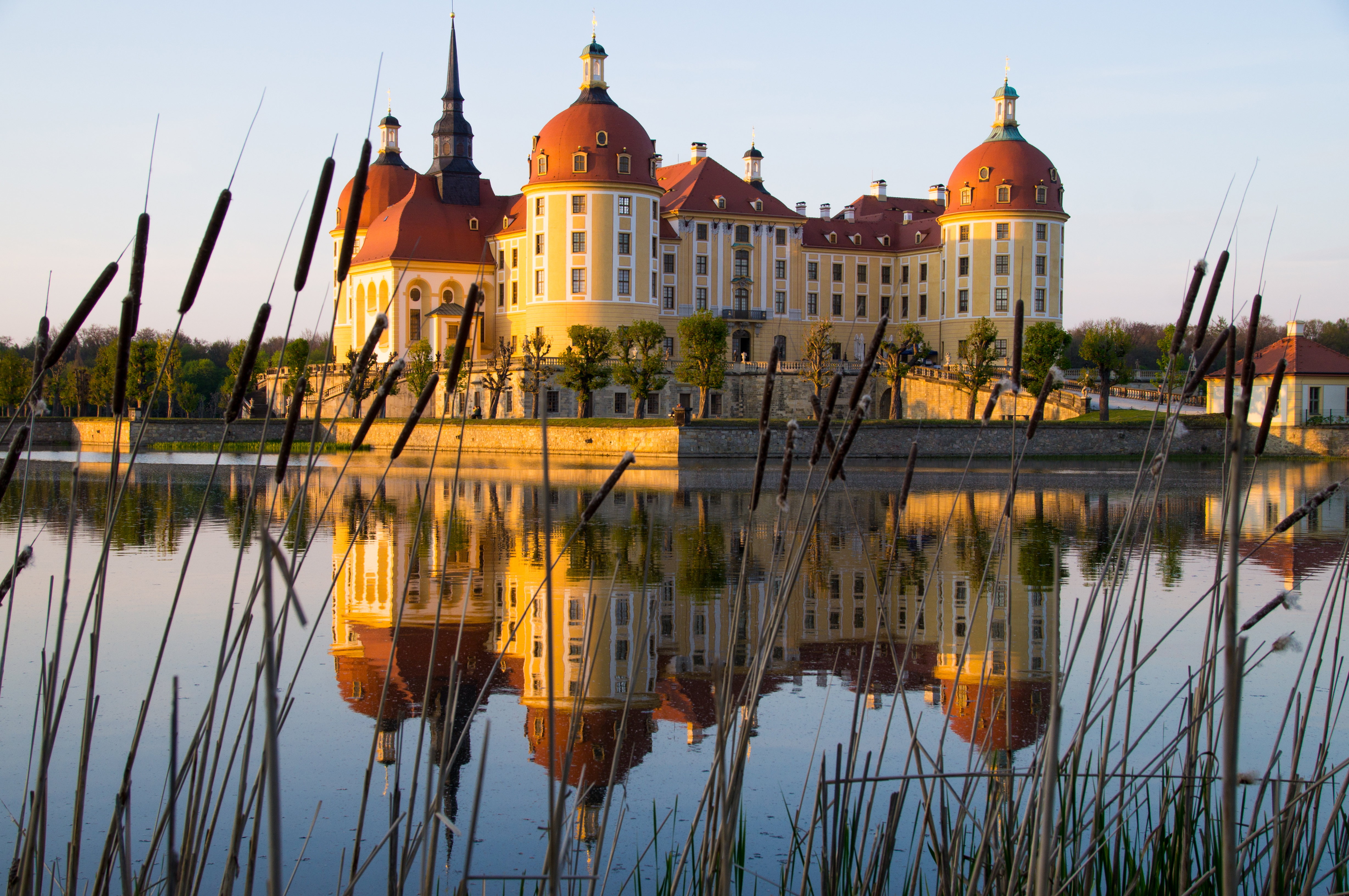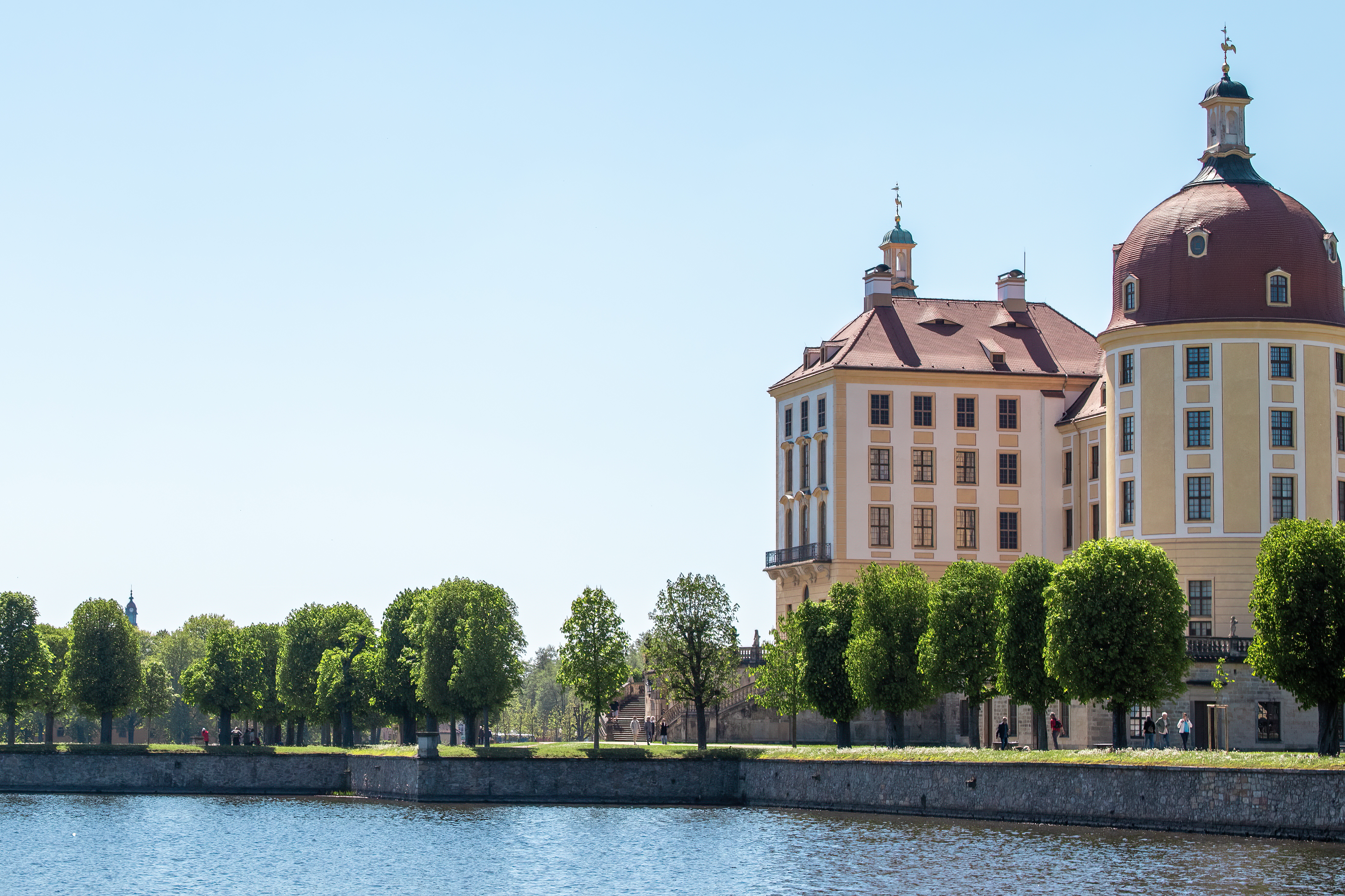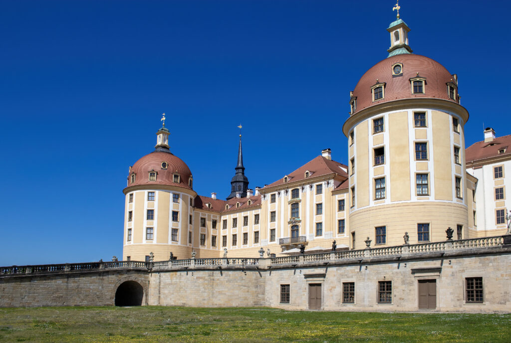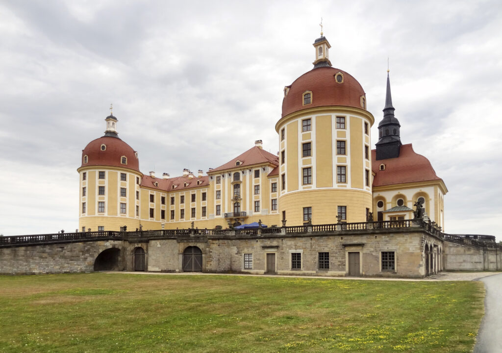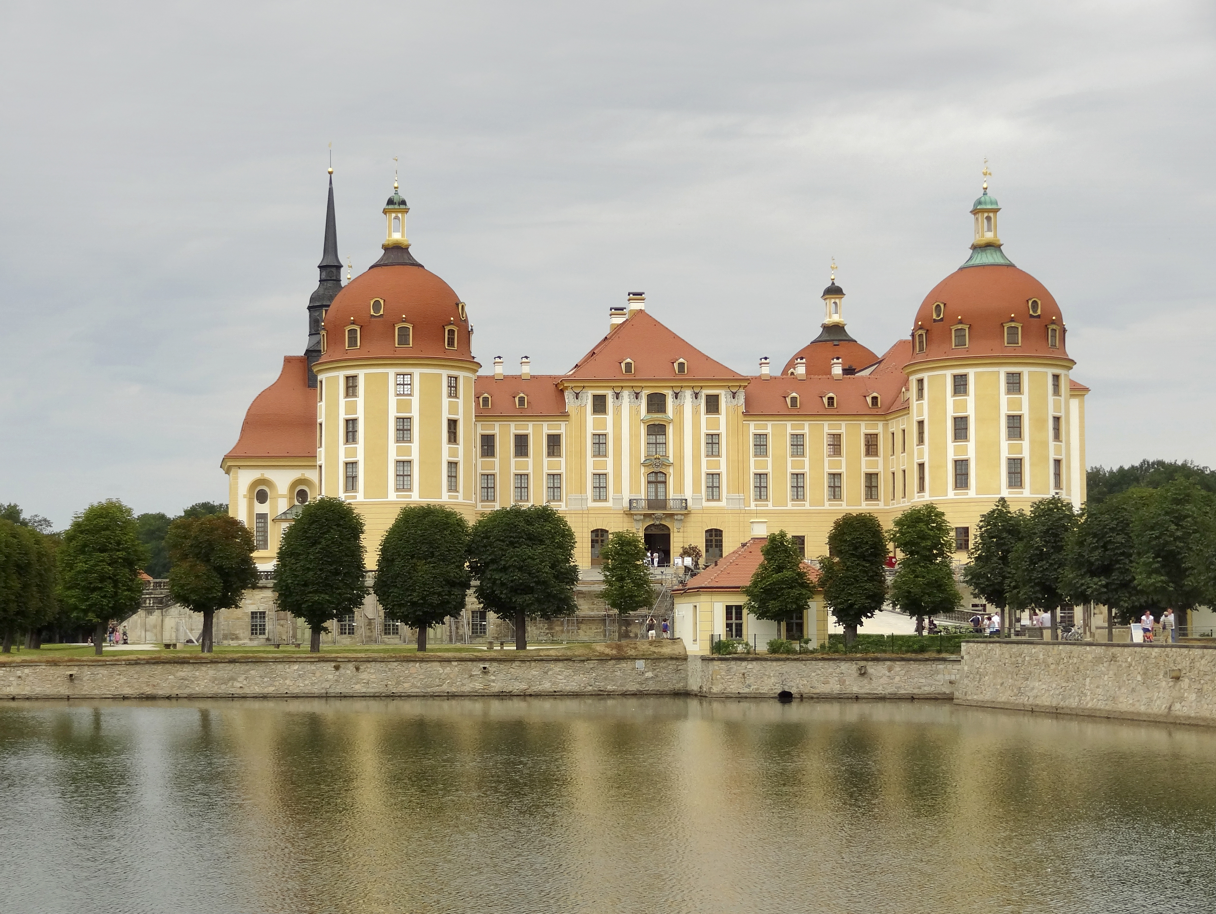A Baroque transformation. Under the reign of Augustus the Strong, Moritzburg underwent extensive Baroque renovations from 1722 to 1730 under the direction of Matthäus Daniel Pöppelmann. This transformation included the demolition of the courtyard walls, a significant elevation and extension of the central building, and the integration of wing buildings with corner towers. Surrounded by terraces, ramps, and bridges, the palace stood majestically amid newly created ponds and animal enclosures, embodying the splendor of the Dresden Baroque style. The palace gardens also continued to evolve, influenced by the geometric precision of French landscape design. Although they remained unfinished due to Augustus’ death, these gardens formed a picturesque extension of the palace’s splendor and blended seamlessly with the surrounding wilderness.