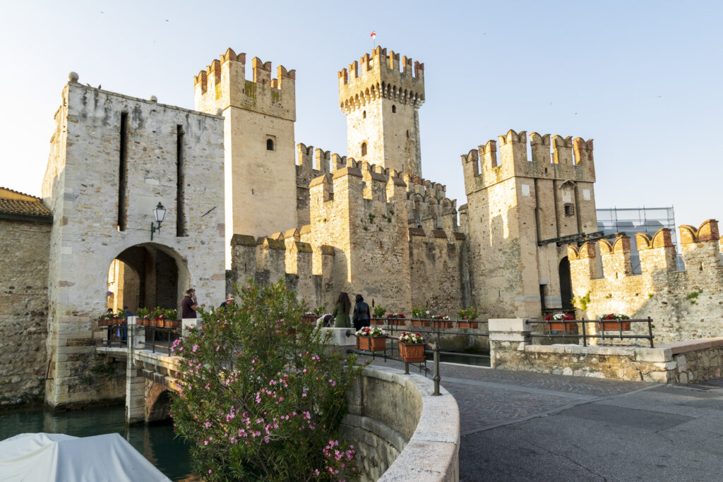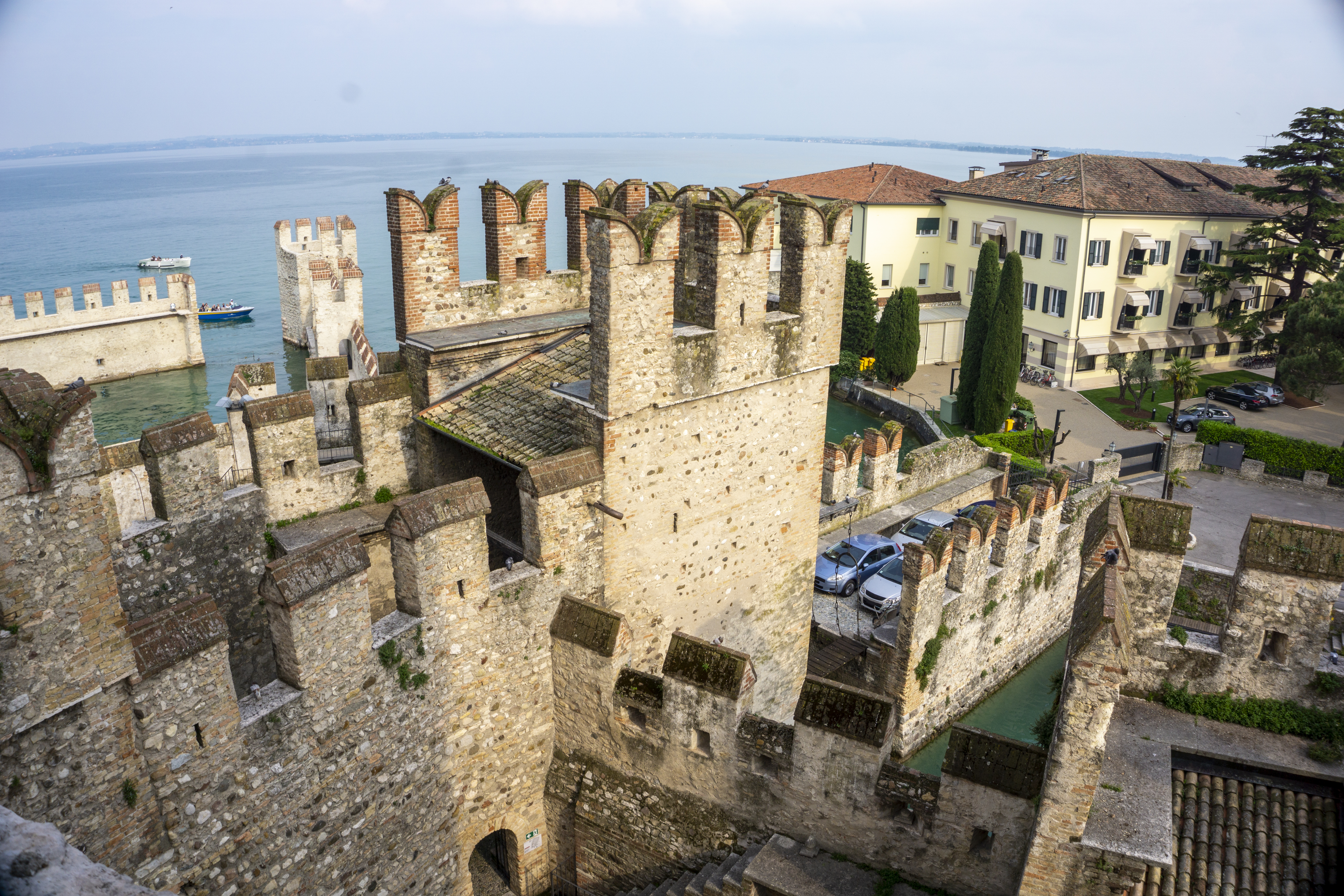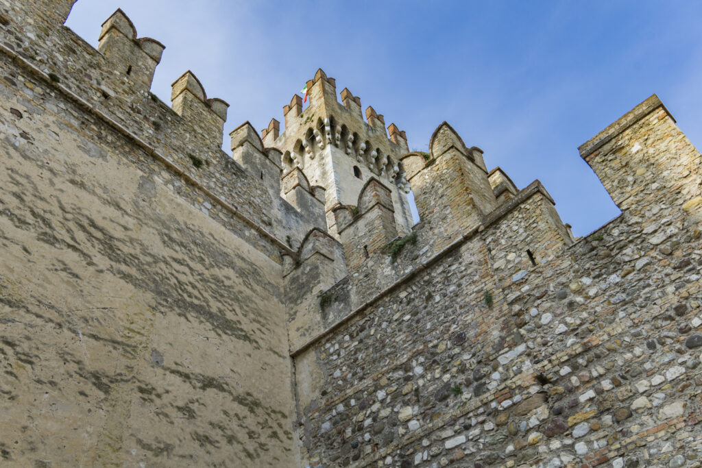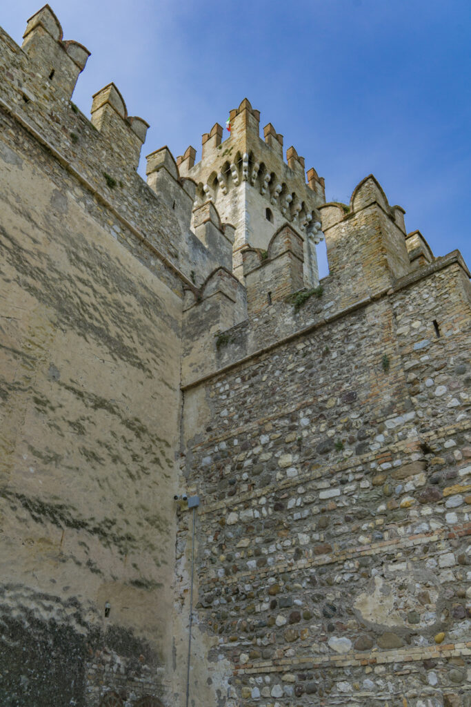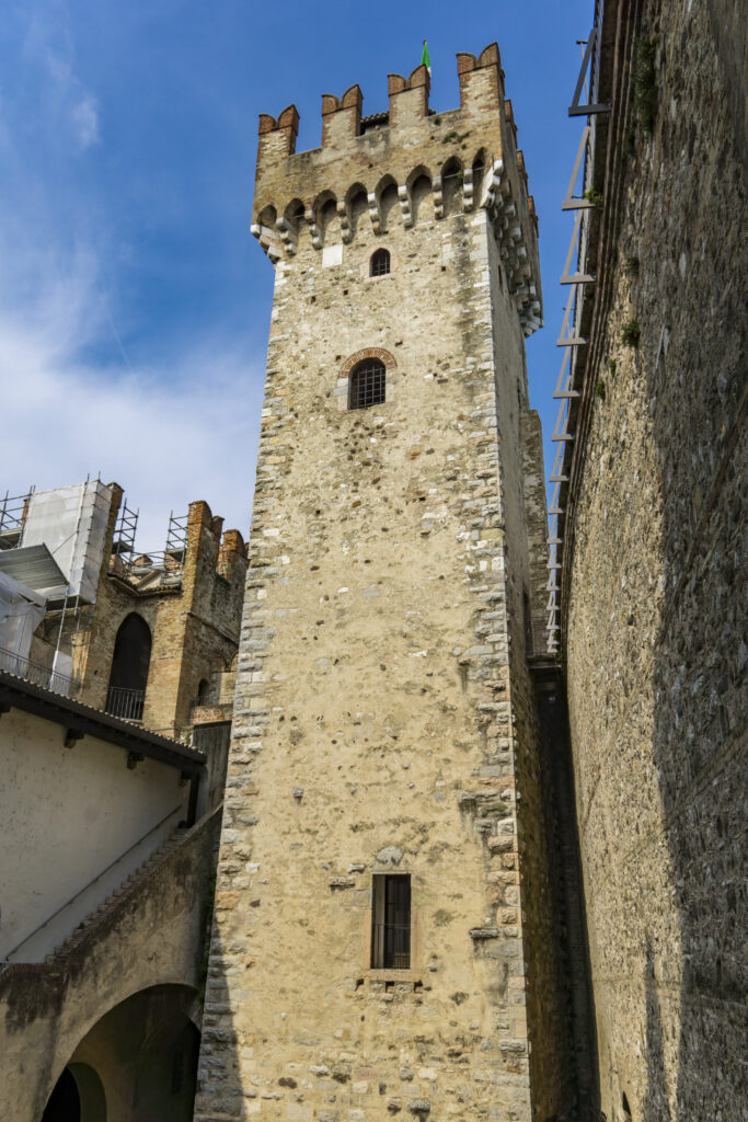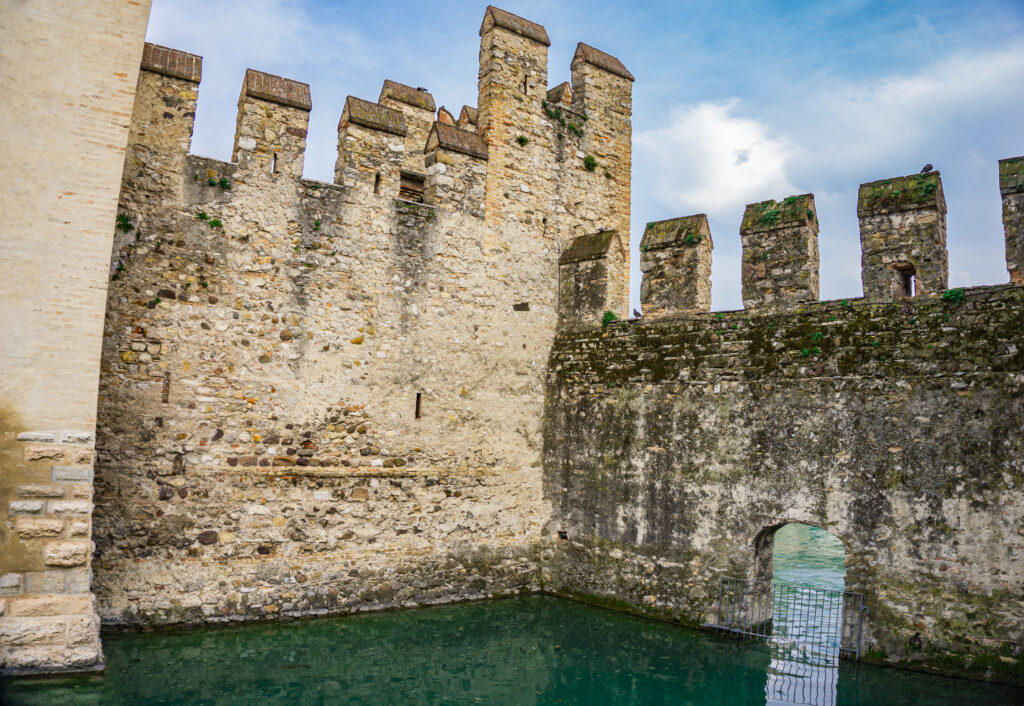 The Scaliger Castle fortress consists mainly of the main castle with its keep and unique harbor. Surrounded by a moat connected to Lake Garda, three sides of the castle offer impressive protection. The western and northern parts have moats up to 15 meters wide and filled with water, while the southern side extends over 25 meters. Inside, a smaller substructure called the “zwinger” separates the main part from the harbor and is reinforced by high walls and Guelf battlements.