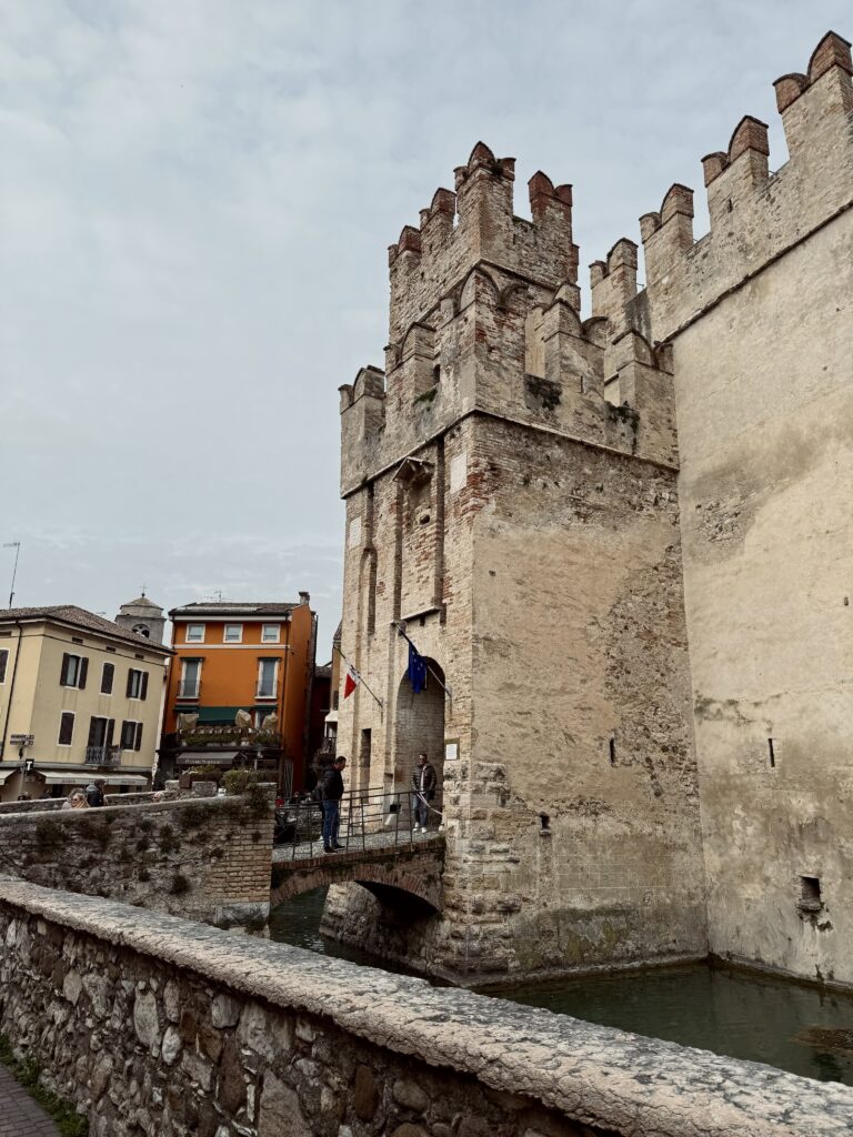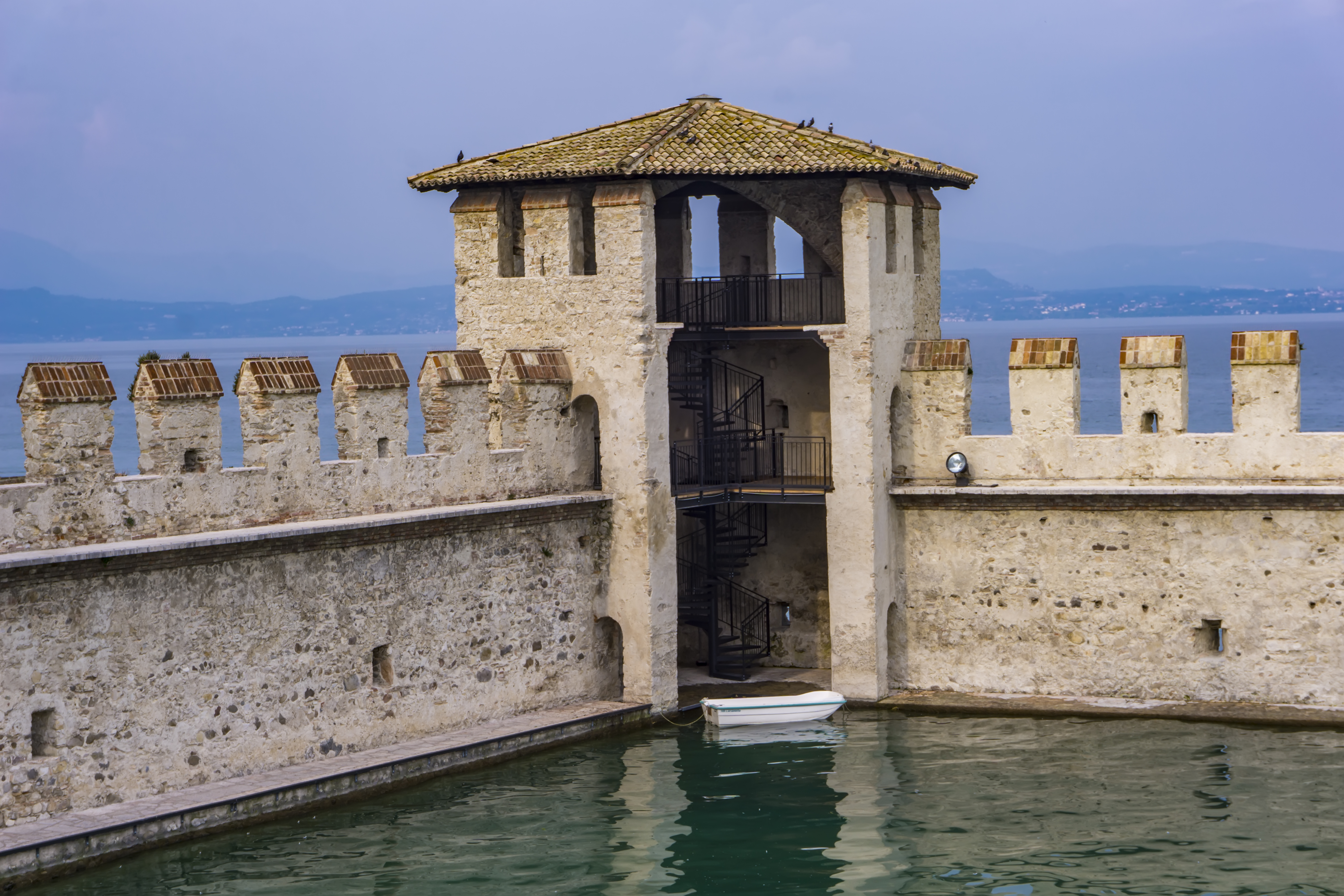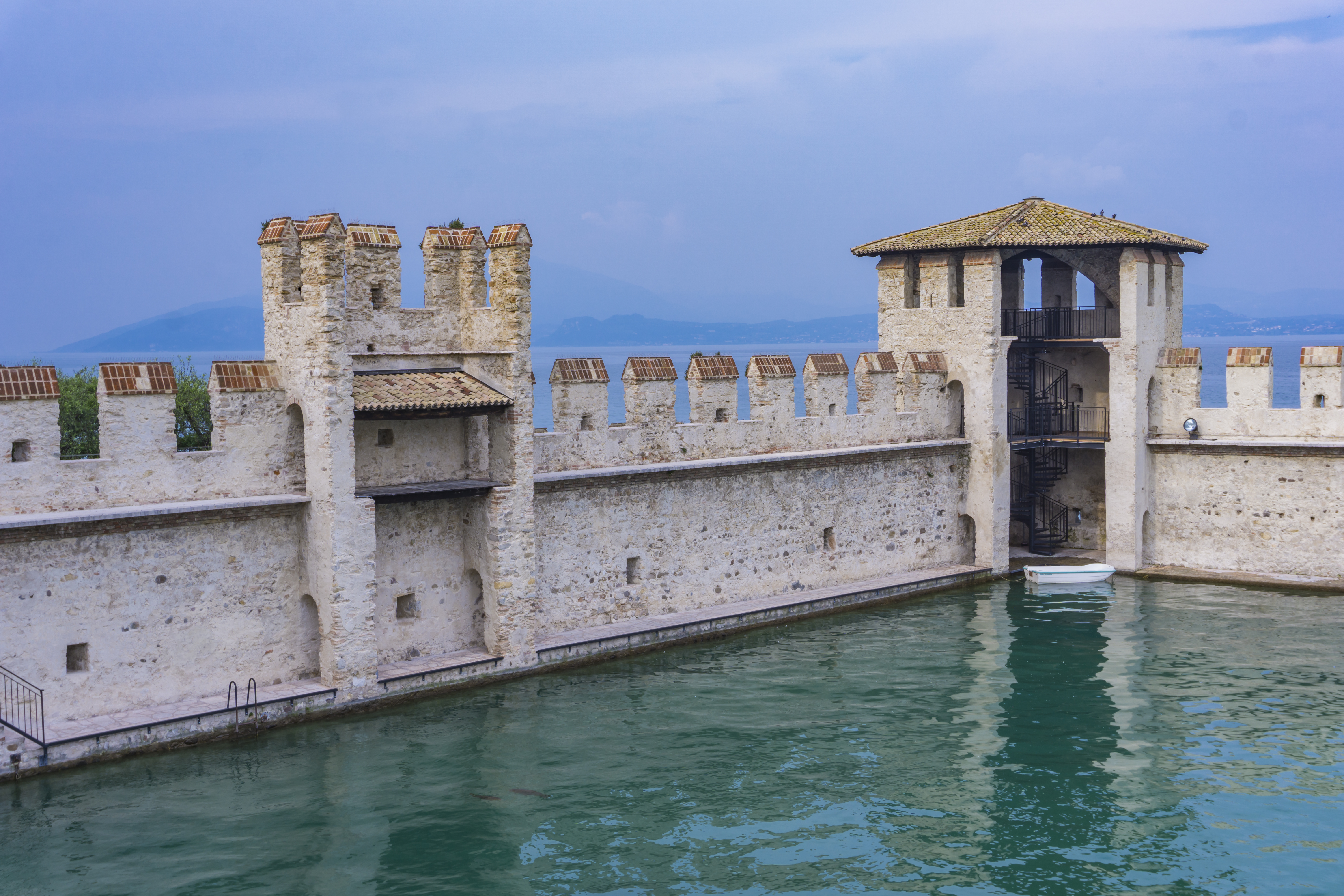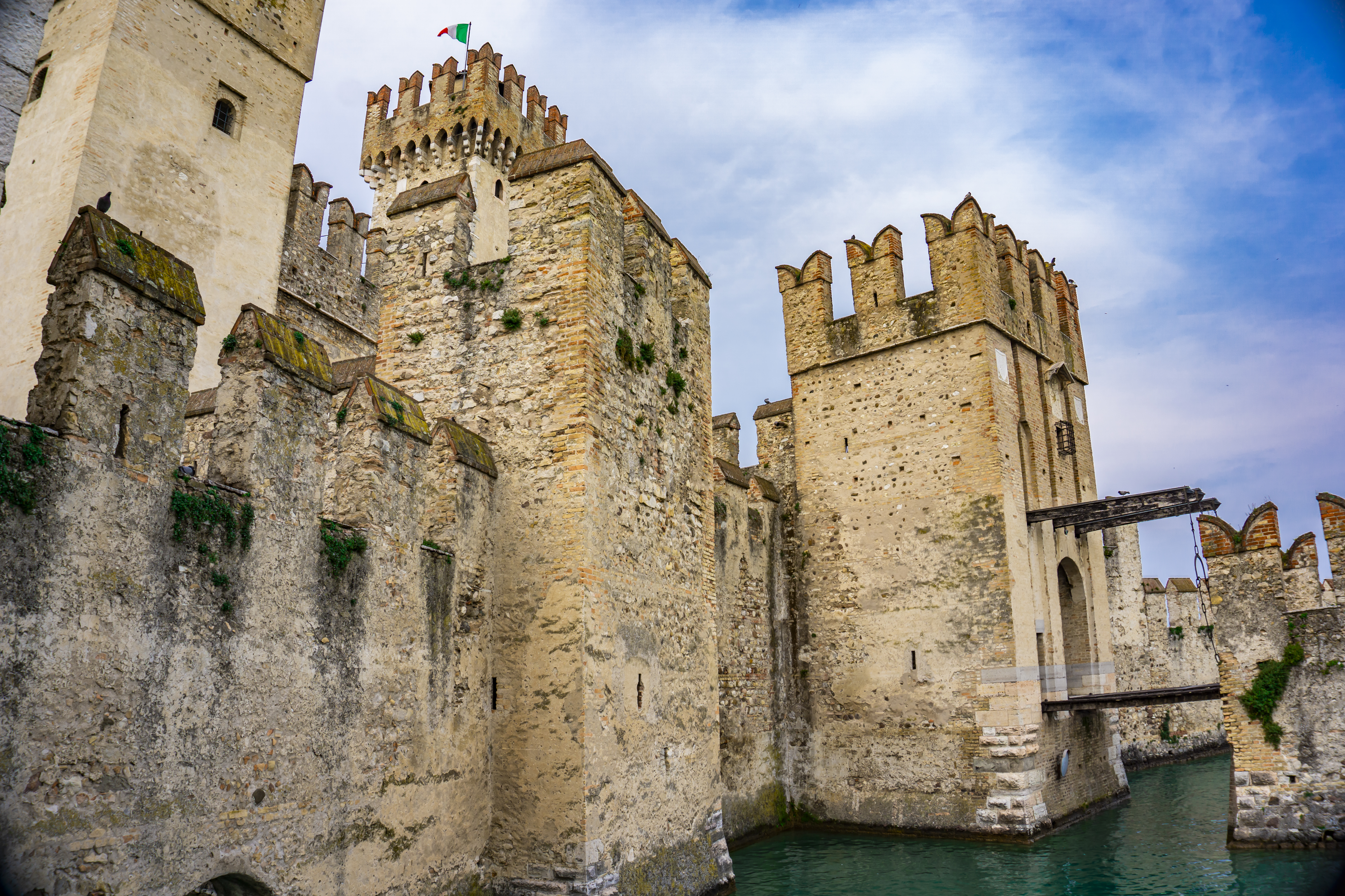 The Scaliger Castle fortress consists mainly of the main castle with its keep and unique harbor. Surrounded by a moat connected to Lake Garda, three sides of the castle offer impressive protection. The western and northern parts have moats up to 15 meters wide and filled with water, while the southern side extends over 25 meters. Inside, a smaller substructure called the “zwinger” separates the main part from the harbor and is reinforced by high walls and Guelf battlements.