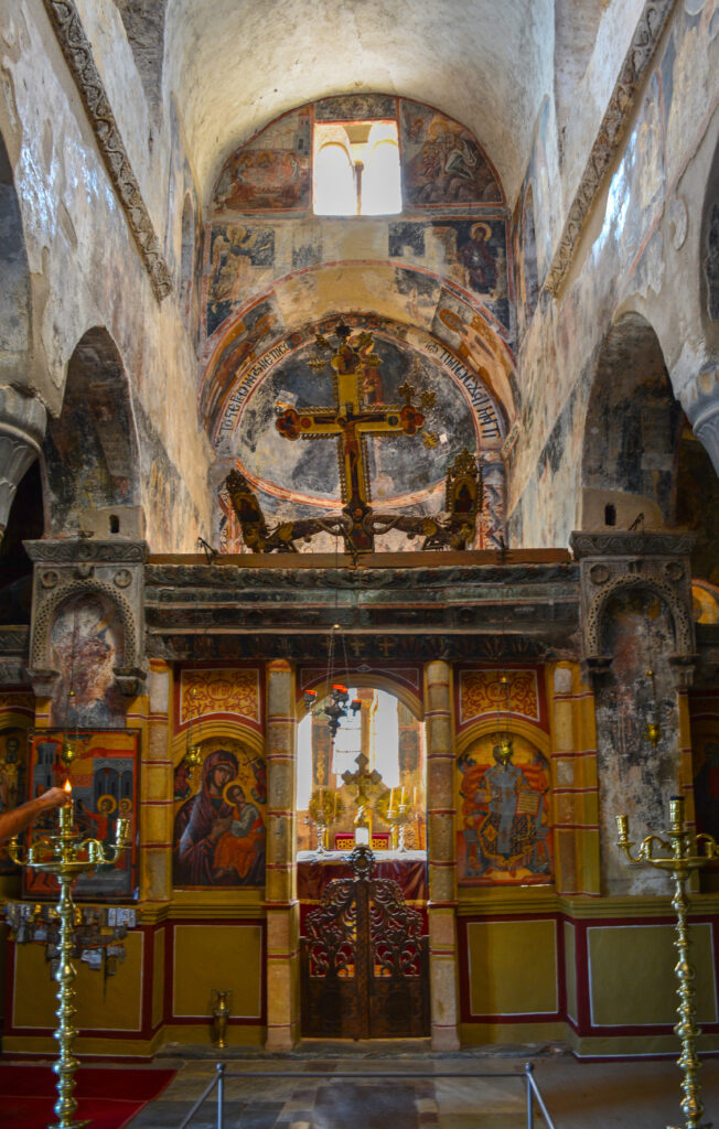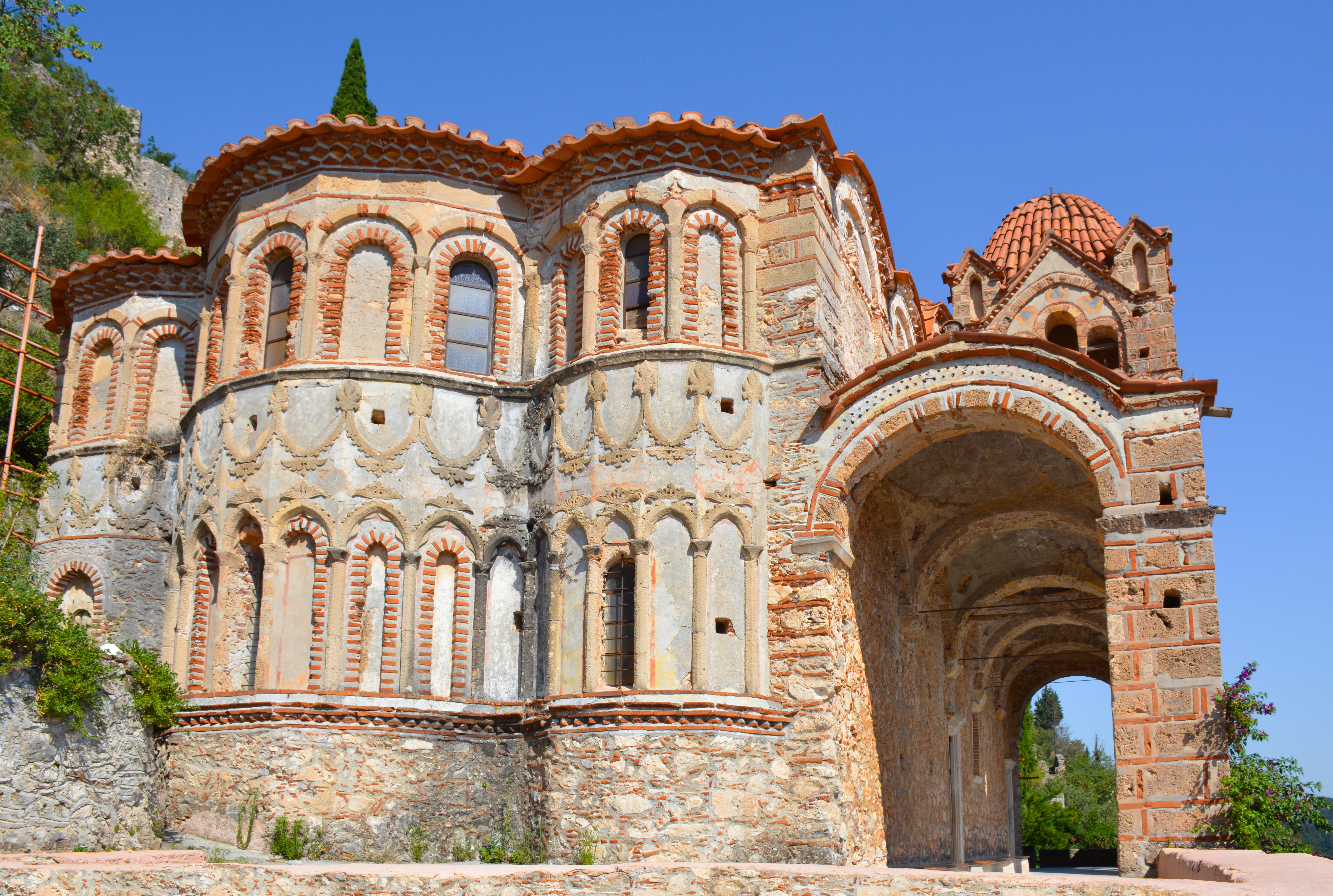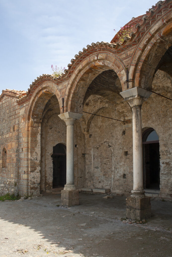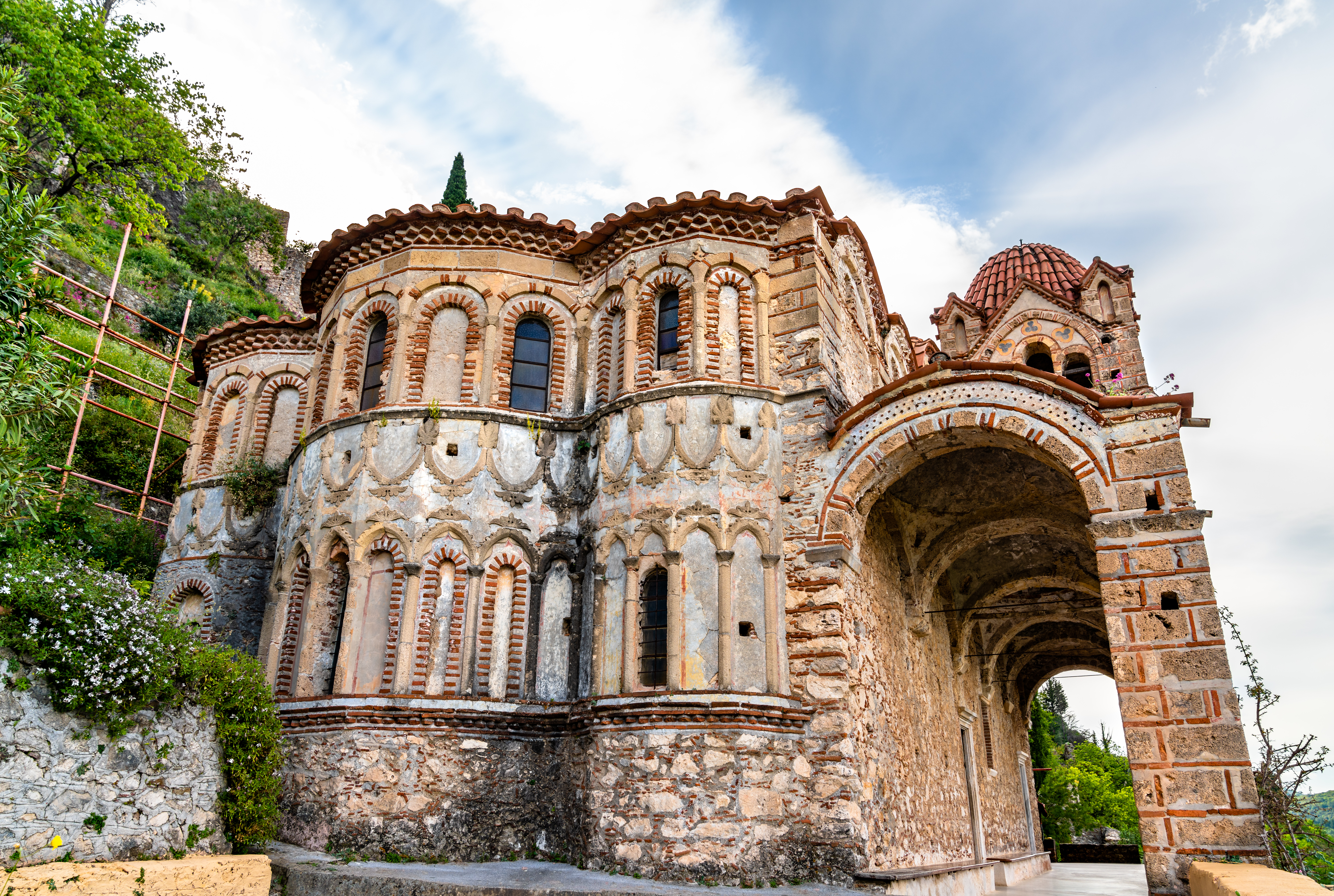 Architectural Masterpieces and Religious Art – The Metropolis, the architectural highlight of Mystras, impresses with a blend of Western-Latin and Byzantine architectural styles. Originally a basilica, it was converted into a cross-domed church around the 15th century. This architectural fusion gave rise to the “Mystras type,” which is unique in Byzantine architecture. The frescoes in the narthex of the Metropolis, depicting scenes from the life of Christ, were damaged by the architectural alterations. Nevertheless, they remain significant examples of Byzantine art. A particularly impressive fresco depicts the Ascension of Christ, in which stylistic influences from both the 10th-century Helladic school and Constantinople are recognizable. The Pantanassa Monastery, another jewel of Mystras, was founded in 1428 by the Frankish advisor Johannes Frangopoulos. It exhibited a distinct Frankish-Gothic influence, evident in the Gothic arches and decorative motifs reminiscent of Sicilian architecture.